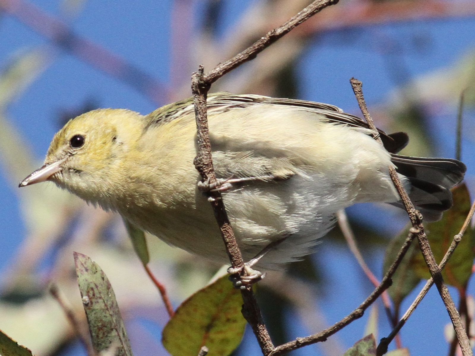 Originally reported on 30 Dec 2012 as a Blackpoll Warbler, this bird is perhaps the most difficult identification challenge among the Parulidae Wood-Warblers. The next day local birders Jay Keller and BJ Stacy relocated the warbler, joined later by Paul Lehman and Guy McCaskie, and revised its identification as a much rarer Bay-breasted Warbler! There are several key diagnostic features that contribute to its identification including most importantly the evenly blue-grey colored legs and feet (including soles of the feet) which can be seen in the photographs below. I also think the undertail coverts have a slight buffy coloration, at least at the sides where they meet the flanks, which is another feature of Bay-breasted Warbler. Looking at details of the plumage from the photographs this appears to be an adult female. Only the outer two rectrices have white markings, and the white mark on r5 is small. In addition the rump has a noticeable lead grey coloration that contrasts with the yellowish-green upperparts.
