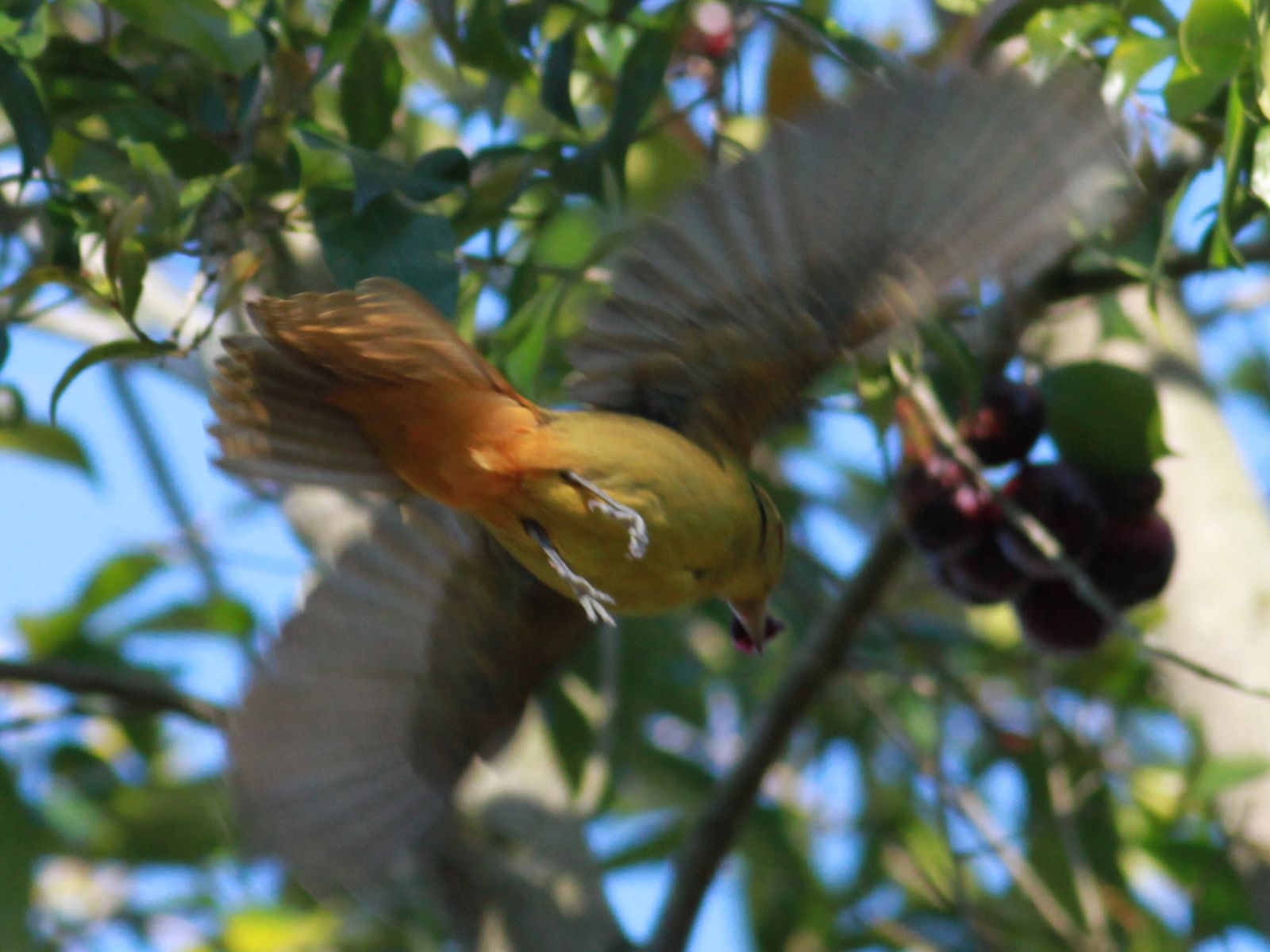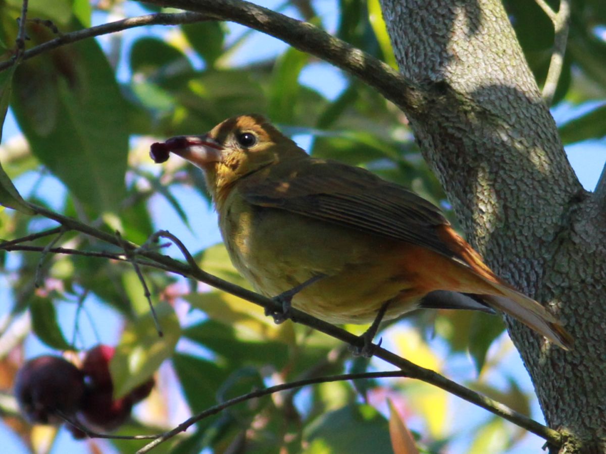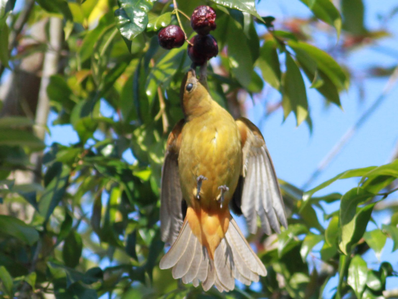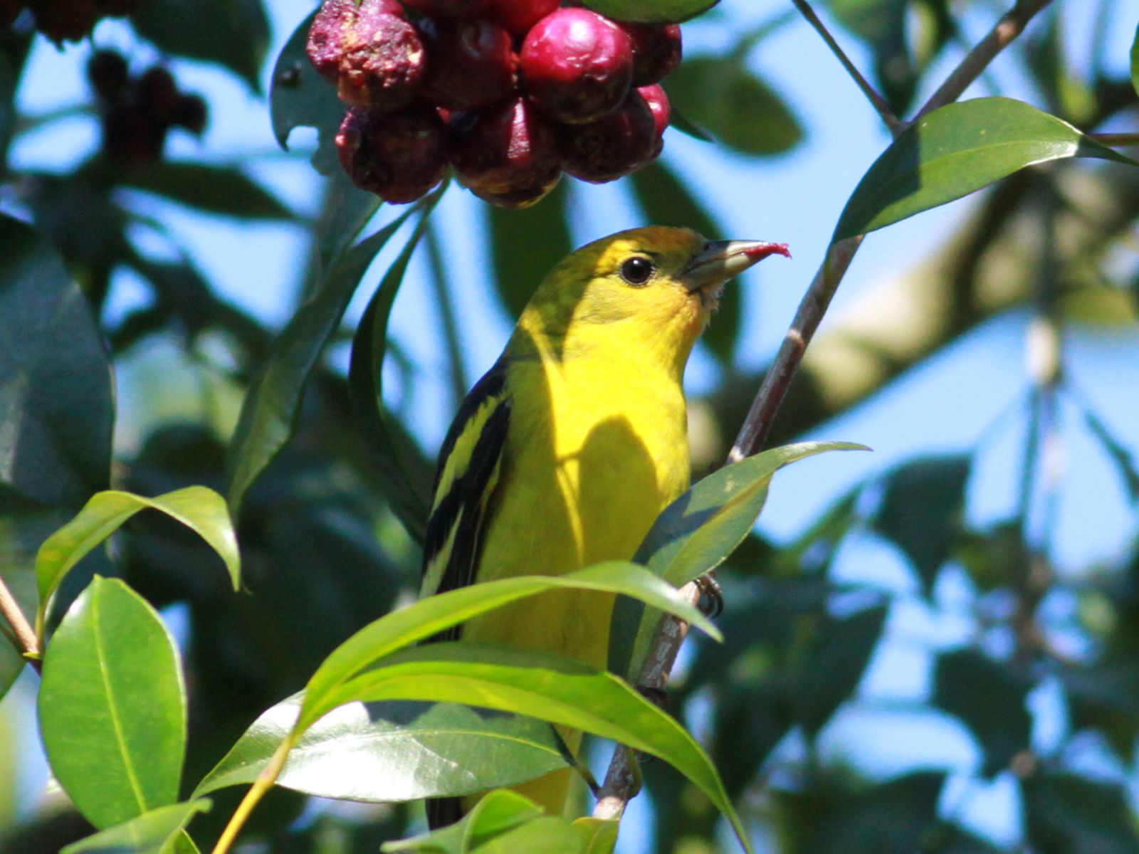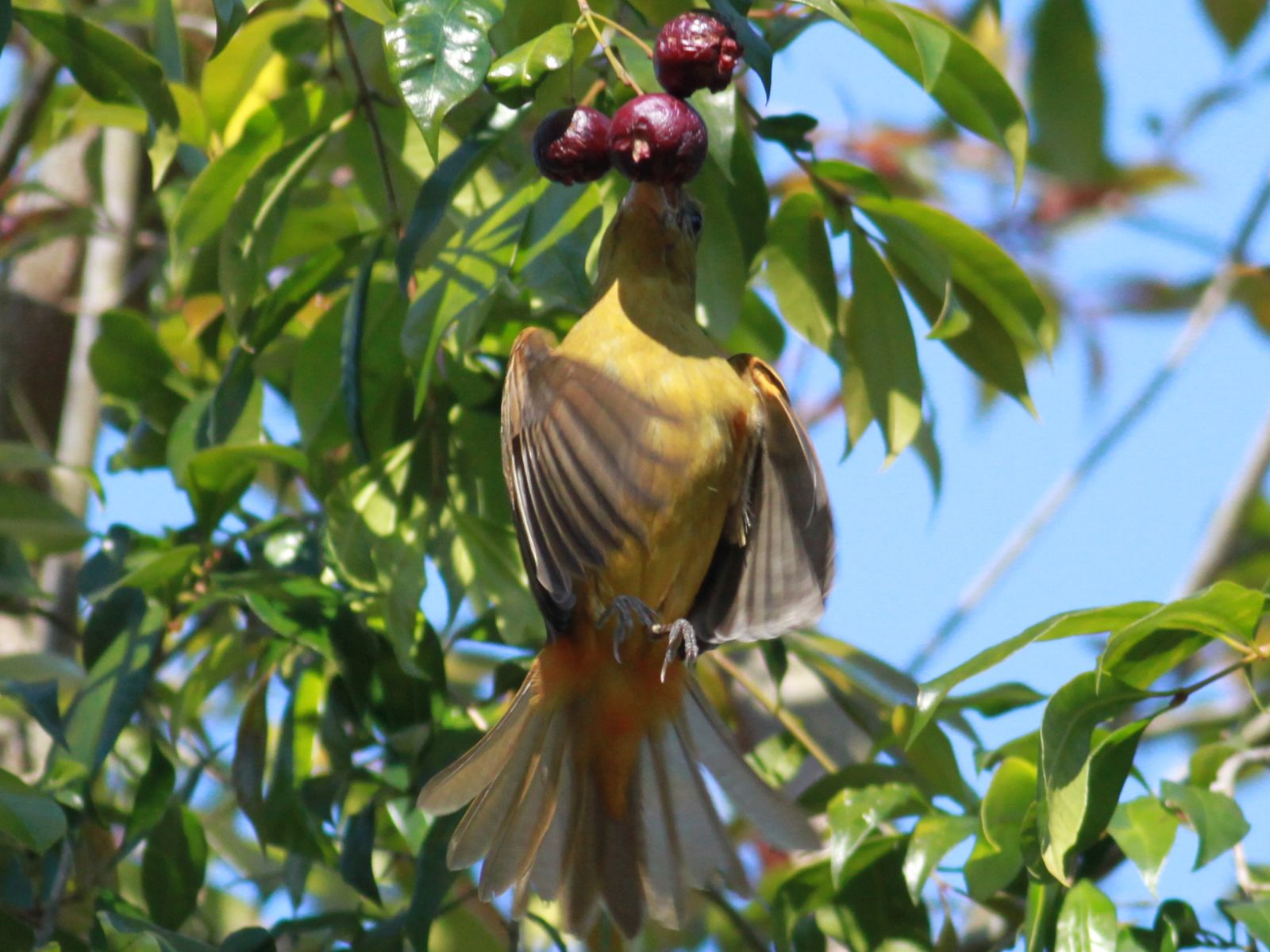 1. The fruit the Summer Tanager is eating is Surinam Cherry, Eugenia uniflora. According to the Sunset Western Garden Guide, the fruit is good for jams and jellies.