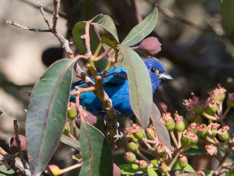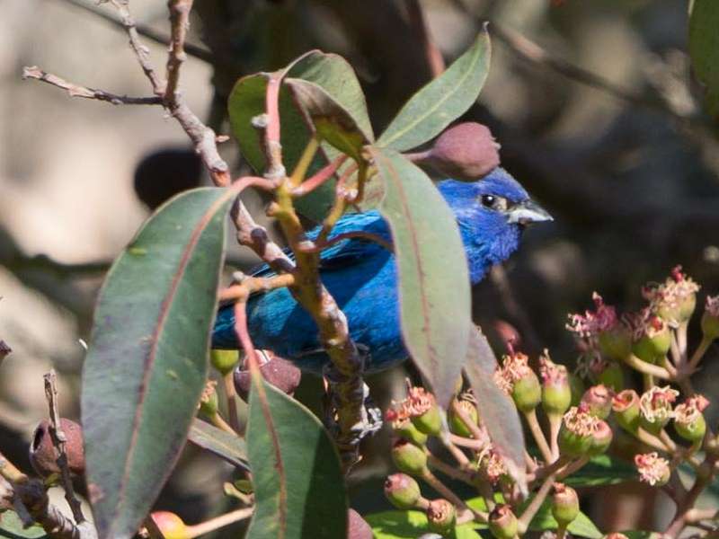 [All photographs copyright, Gary Nunn 2014] – An early evening walk around Fort Rosecrans National Cemetery paid off when I caught sight of this stunning male Indigo Bunting Passerina cyanea passing behind me and into a cypress tree. Backlit by the sun, as it flew by me, I immediately noticed the shiny looking high gloss plumage which is unusual on such a small bird. Sure enough, as it twisted in flight, the blue body was easily visible just with the naked eye. I hurried uphill to get ahead of the fast moving bunting as it traveled from tree to tree staying well concealed. Finally I made it in front and heard it calling from inside a flowering eucalyptus tree crown. I waited a few minutes but it would not emerge by itself and I figured it would be off flying soon! So I switched tactics and coaxed it out by playing a recording of the typical repeated “spik” call, to which it responded vigorously calling and then finally emerged from hiding. But after a couple seconds off it flew westwards never to be seen again despite considerable searching! This is a very fine looking male with indigo head and blue body – I wish it would have sat out in the open!