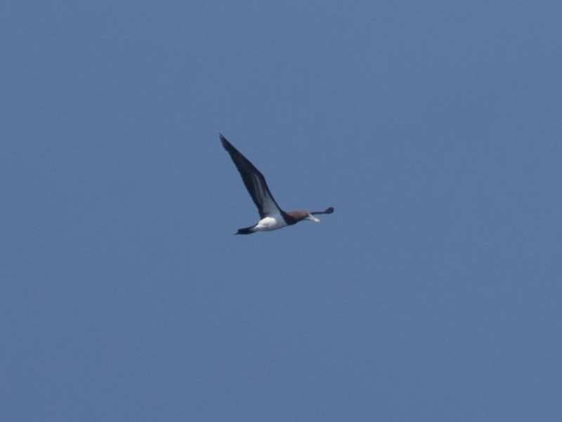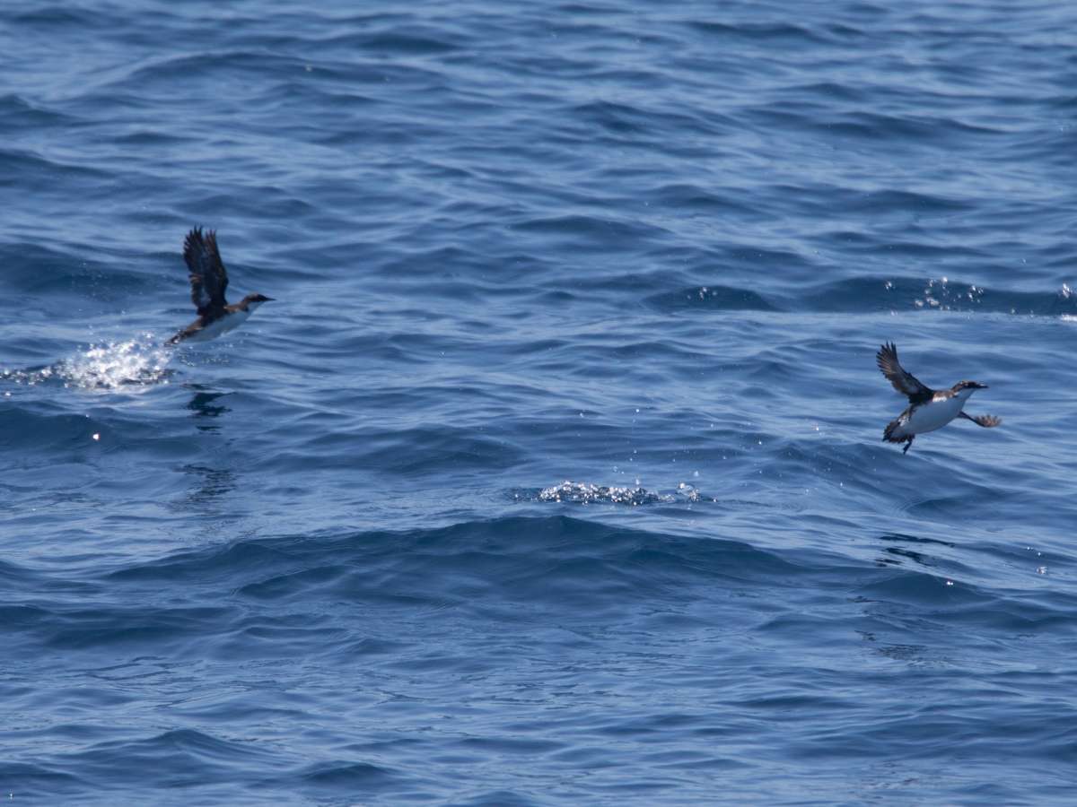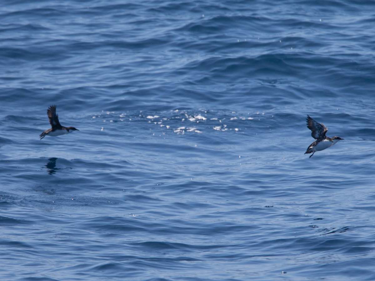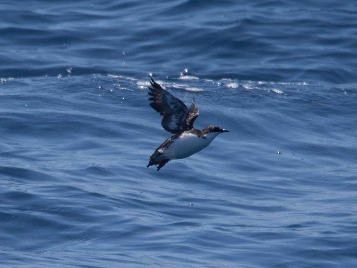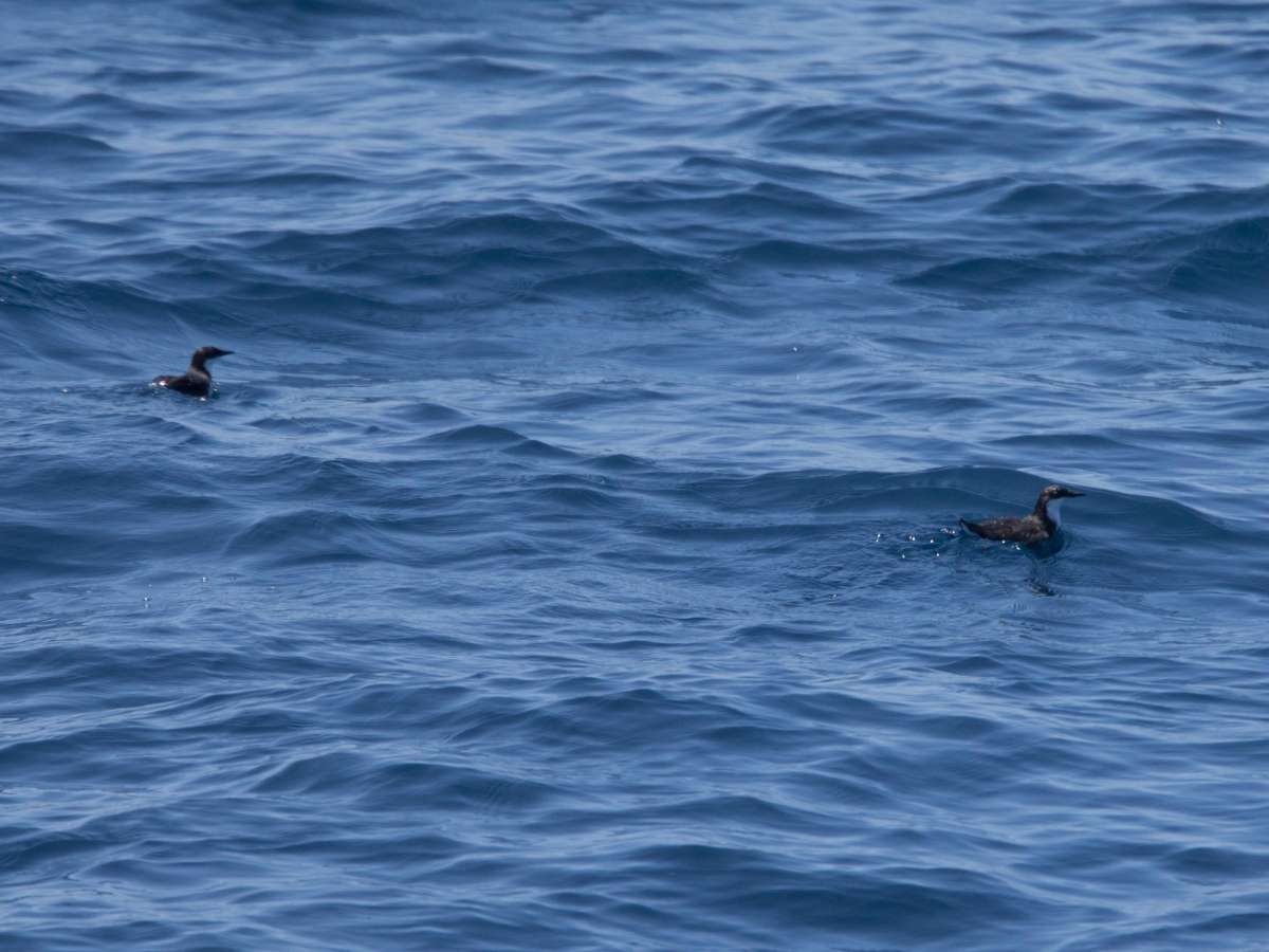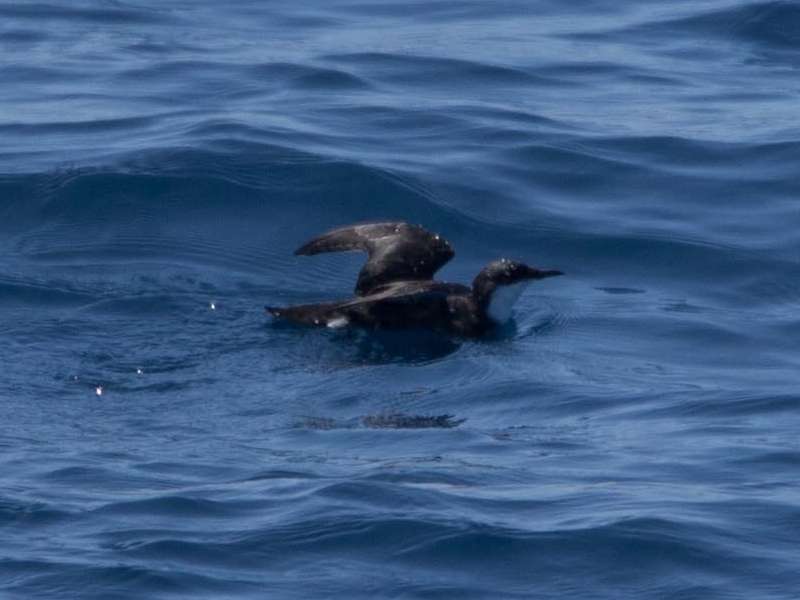 [All photographs copyright, Gary Nunn 2014] – I decided to try my luck aboard a whale watching trip today 06 July 2014 out of San Diego and did not come away disappointed. A little over a mile outside Point Loma I quickly spotted a subadult Brown Booby Sula leucogaster ahead with many Elegant Terns marking a fish shoal. The booby circled a few times in the distance but never approached closely so photographs are only documentation worthy. An hour or so later, approximately five miles due west of Point Loma, we motored right by two small black-and-white alcids sitting on the water with giveaway small cocked up tails. As they took flight parallel to the boat the dusky blackish marked underwing and black chest side spurs could be easily seen on this pair of Craveri’s Murrelet Synthliboramphus craveri. Not a bad find from a whale watching trip! The underwing of this species is somewhat variable in extent of black markings and these two birds showed one dark and one lighter example. The lighter underwing individual may be in active molt of its wing coverts which might explain the patchy appearance. Certainly they have darker underwings than either Scripps’s or Guadalupe Murrelets and both these species appear very much whiter on the underwing. The “Blue Whale Watching Adventure” lived up to its name too with good looks at 8-10 individuals of this whale species, some at close quarters.