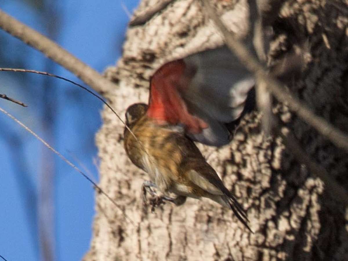 [All photographs copyright, Gary Nunn 2014] – This first winter male Rose-breasted Grosbeak Pheucticus ludovicianus flew across the path in front of me at the Bird and Butterfly Garden in the Tijuana River Valley on 25 September 2014. In the late afternoon sunlight the red underwing coloration was unmistakable. Quickly relocating it in a nearby tree I trained the camera on the stationary bird and inched closer until it flushed off the branch. A quick burst on the camera shutter button and I captured a few easy photographs of the underwing! In addition to the red underwing the rich buffy underparts are noticeable on this bird. I was surprised by the extent of buff coloration extending down the flanks which I guess you would not notice if the wings were closed. It was exceptionally dry in the garden and this bird was taking a drink from a running irrigation line sprinkler, underneath a pomegranate bush, when I happened to walk up on it.